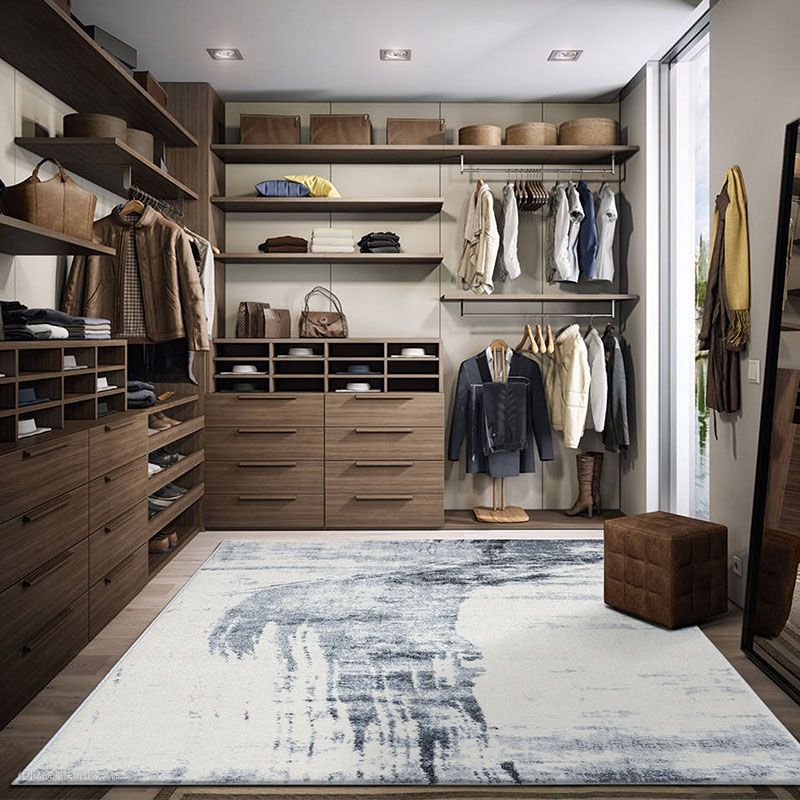 不管是步入式衣帽间还是单独的衣帽间,我们都可以选择在地面铺上抗静电地毯或地板,不易起尘,保持干净。最好不要选择发泡地垫等容易“吸土”的地面材料。