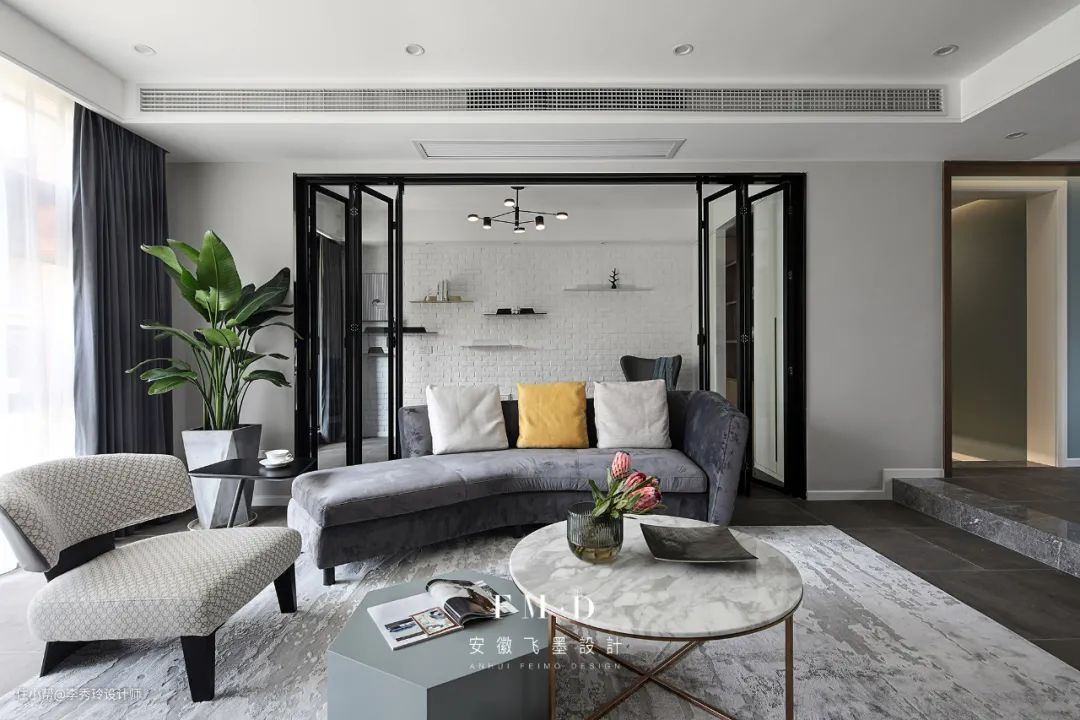 既想要互动效果,又想要安静的工作状态,那就在中间加上玻璃折叠门,关上门后可以完全隔绝外面的声音,又能随时关注到客厅里的生活场景。