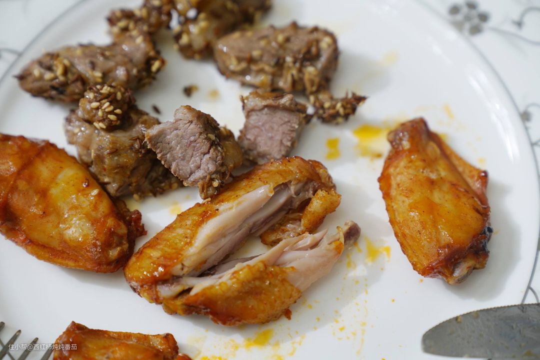 鸡翅腌制好后放在烤盘直接烤,调整至 250℃ ,工作 12min左右就熟透了。烤出来的翅中肉质紧致又嫩滑,效果有被震惊到。楼主印象中鸡翅是很难烤得好吃的,居然被我一次做到了;烤牛肉块时设置温度为 100℃左右,时间约 10min就够(如果喜欢熟一点的可以多烤一会儿。不过牛肉是嫩一点好吃)。