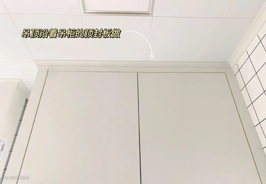 如果能在做完吊顶之后,确保吊柜能精确复尺,就可以先做吊顶,最后把橱柜严丝合缝的装上去,如上图。