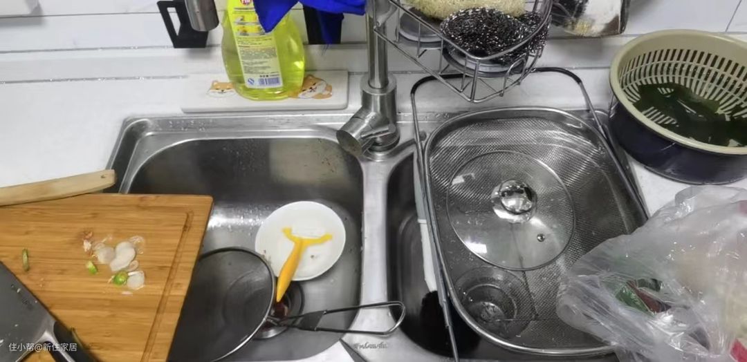 一边稍高七八公分左右,低处可以存水洗碗筷,不像大单槽存水洗非常浪费,清洗大锅时锅把也能放在高处,没有双槽的局促感。