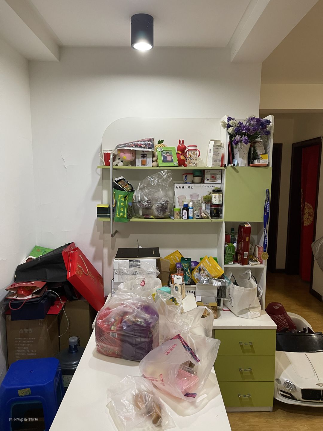 这是同事家里的开放格餐边柜,说实话,本身颜值也不咋地,再被塞得满满当当,非常显乱。