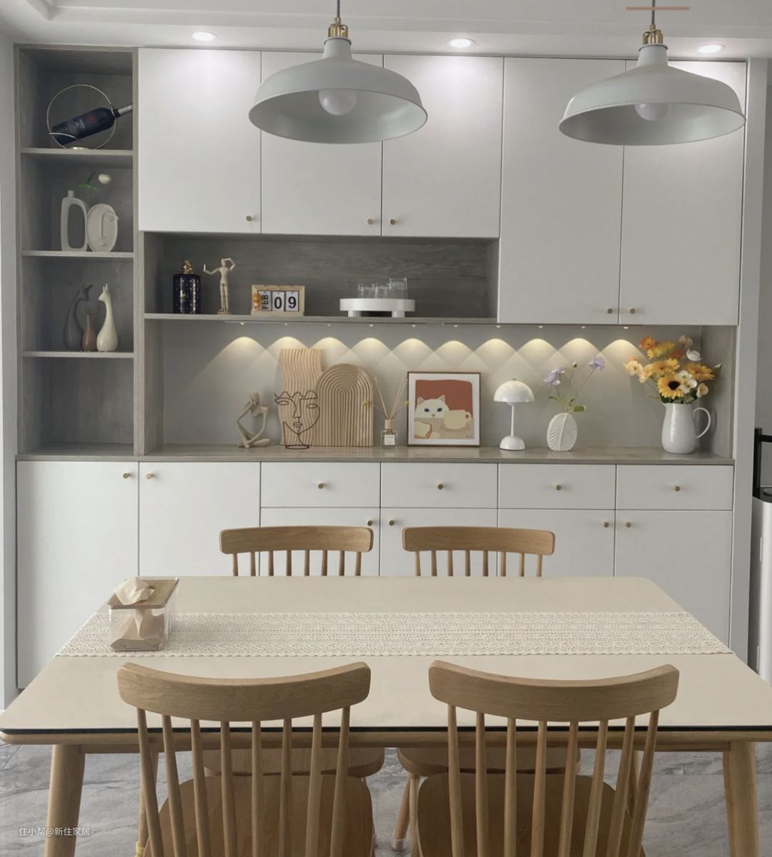 新小住建议:家里要做餐边柜的话,不管是成品的还是定制的,都建议做成带柜门的,即便不是勤快人,也能把乱藏在里面,最起码“显得干净”。