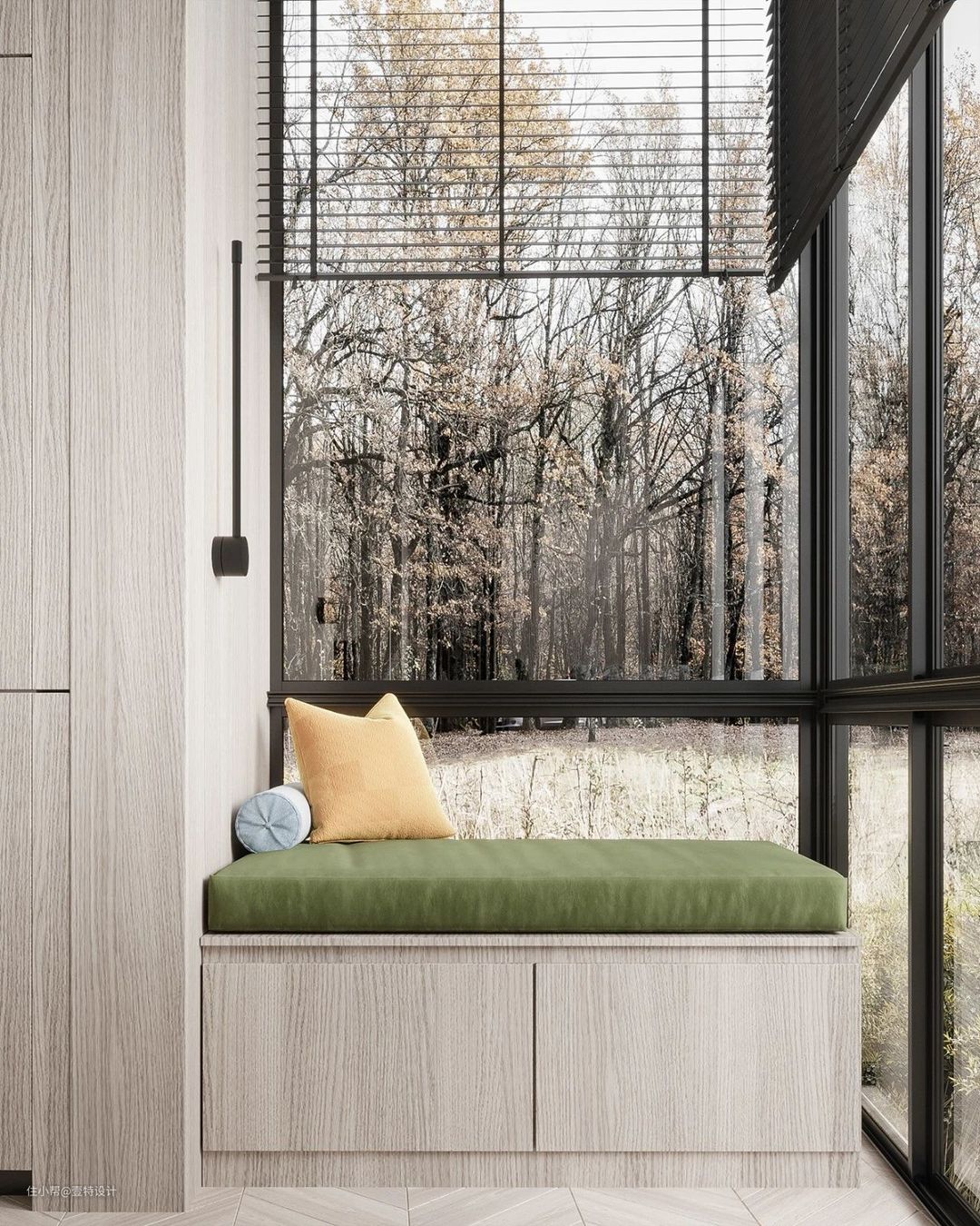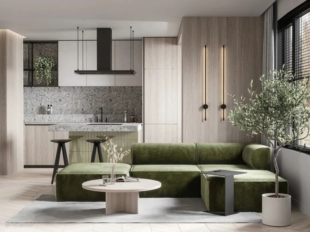 质朴自然的原木色空间里,果绿色的布艺沙发给静谧的空间里加入了温暖的色彩。自由生长的绿色植物如珍藏的艺术品一般,优雅而又惬意,为室内带来一丝大自然的气息。