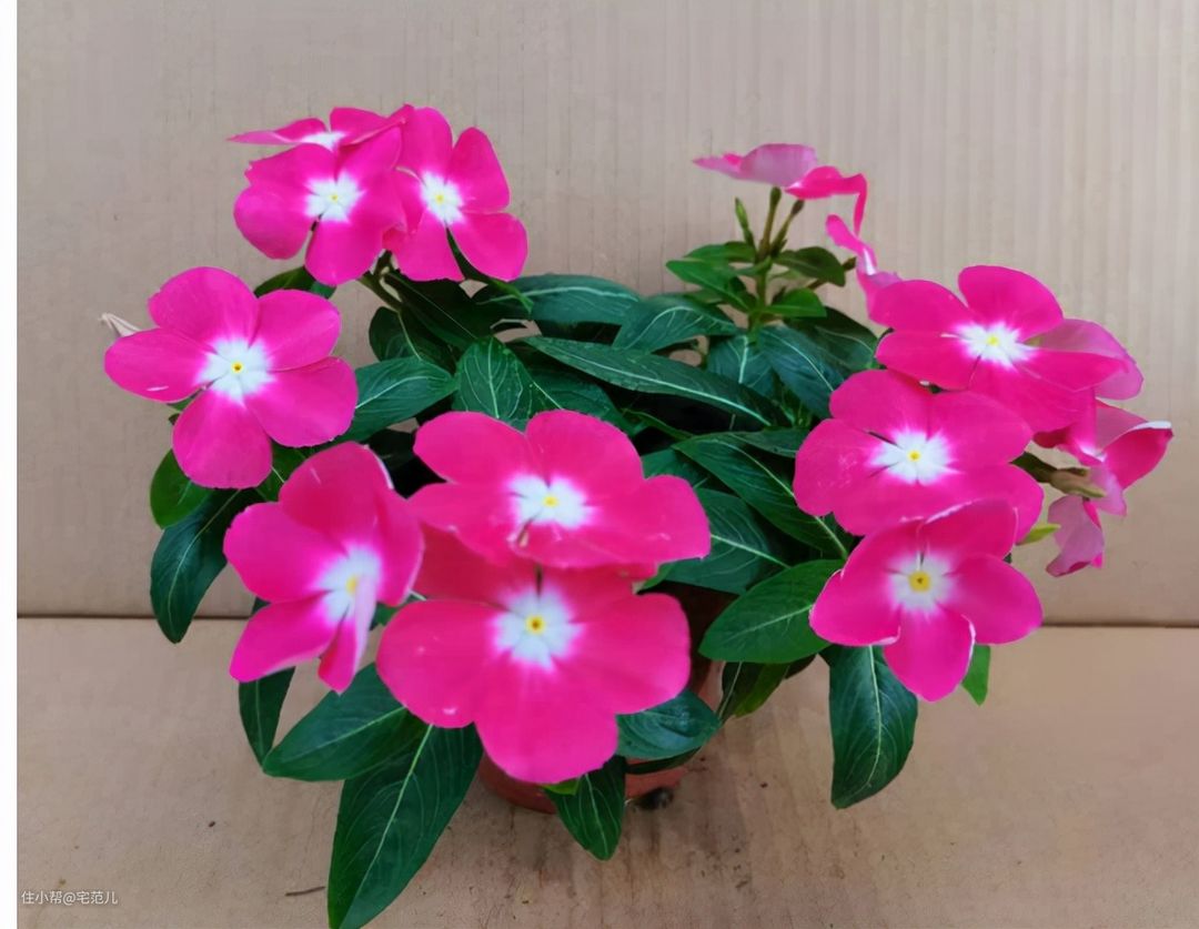 长春花也就是我们常说的四季梅,它一年四季都开花,叶片翠绿,花朵大而美丽,像一朵朵小梅花,总能让人们想起快乐的事情,因此花语是美好的回忆,看到这里,你是不是也特别想养一盆呢。
