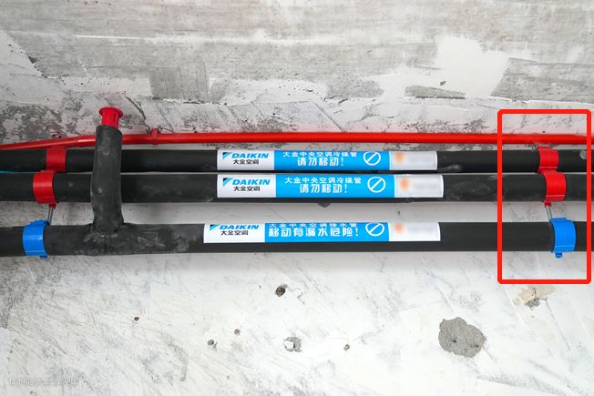 冷媒管与排水管在布管时,你需要留意你们家安装师傅是否共用抱箍了,正确的做法是冷媒管道和排水管要分别用抱箍进行固定,而且抱箍的位置尽量保持在一条线上,保证冷媒管和排水管之间有合适的距离。如果共用抱箍会导致空调在运行中对冷媒管和排水管造成一定的振动,时间长了管道会发生一定的位移,或多或少会影响空调的效果。