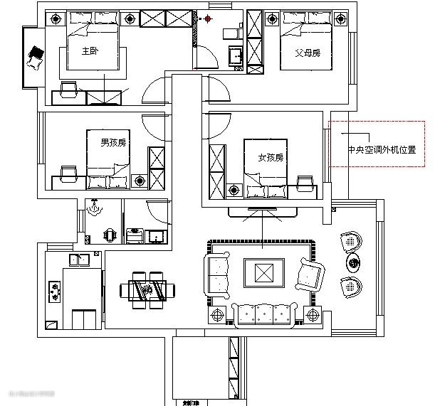 举例:如中央空调可放置外板恰好是在卧室厨房外,如下户型结构。