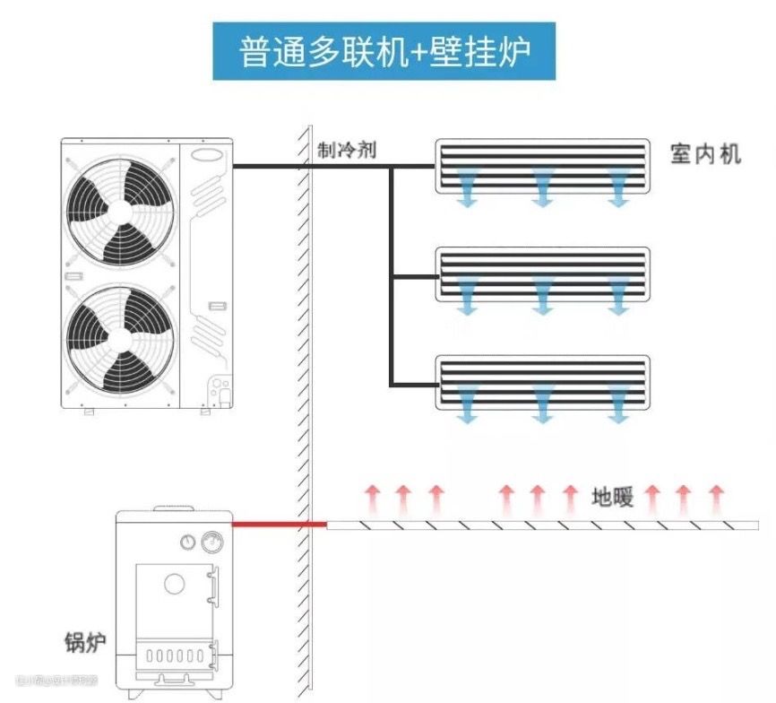1)运行机制:水做介质,室外机完成制冷循环的所有过程,是一个完整的系统。室内机只是简单的热交换作用,两者互相独立。