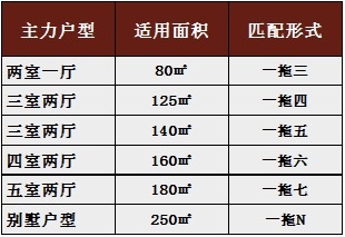 PS:一拖六及以上的中央空调外机高度至少有一米四,有的甚至一米六,是严重影响光线和美观的。这种情况下一拖六可以改为一拖五+1个挂机,或者一拖五+1风管机,或者一拖四+一拖二。(具体情况视房型而定,如是一拖五需要选择外机高度在1000左右以不挡住窗户开关为宜。)