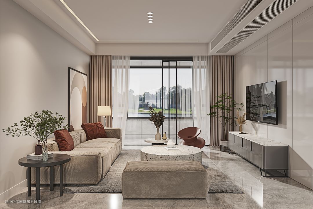 步入室内,温馨、优雅是整个空间格调的主题,以米灰色墙饰为基底,局部辅以番茄红、奶咖色、清新绿作为点缀,再加上家具材质本身温润的质感,让室内呈现出十分动人的视觉效果,氛围感十足。