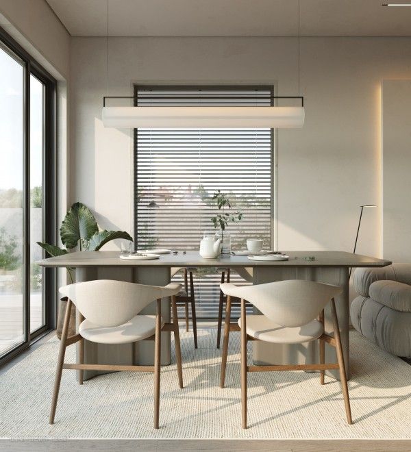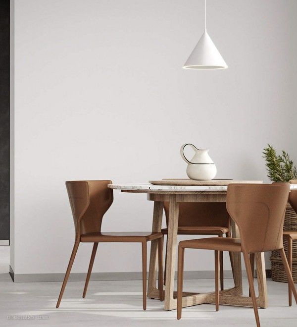 选择吊灯的时候,单一灯具的直径可以选择桌面宽度的一半左右,相对比较和谐;组合灯具可以采用不同造型或是色彩,高低错落布局,更有艺术感。吊灯越低,餐桌周围的氛围就越好,当然也不是越低越好,要保证能看到坐在对面的人,高度距离餐桌75-100cm较为合适。