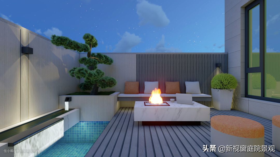 后院主要作为户外的休闲会客区,网红悬浮座椅氛围感十足,现代简约的户外家具配合流水鱼池,简约不乏高级感。灯带的作用也很重要,夜晚到来,庭院又是另一幅模样啦。