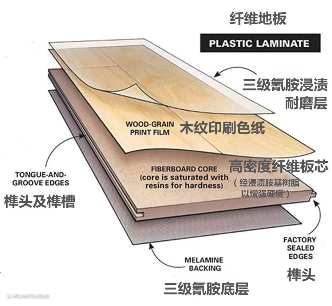 超耐磨木地板(纤维木地板)一般厚8~12cm,由4层物料组成。