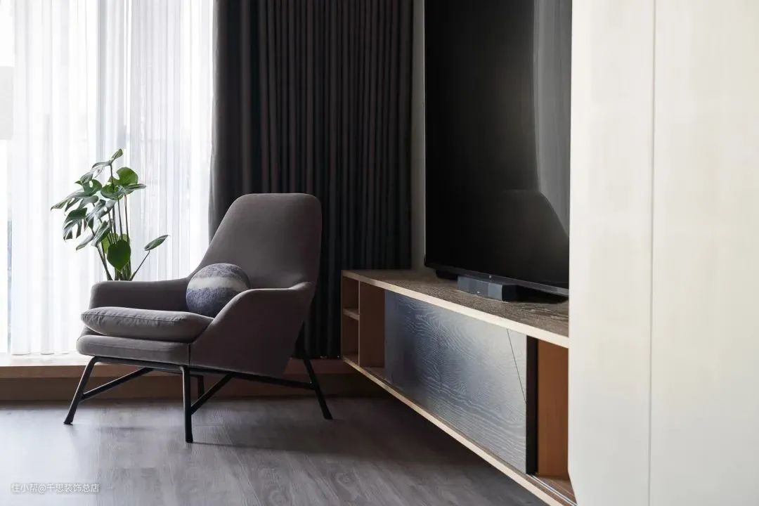 ▲电视墙是木质定制的,旁边布置一张休闲沙发椅,结合绿植的装饰,在日光的沐浴下,营造出一种轻松舒适的从容体验。