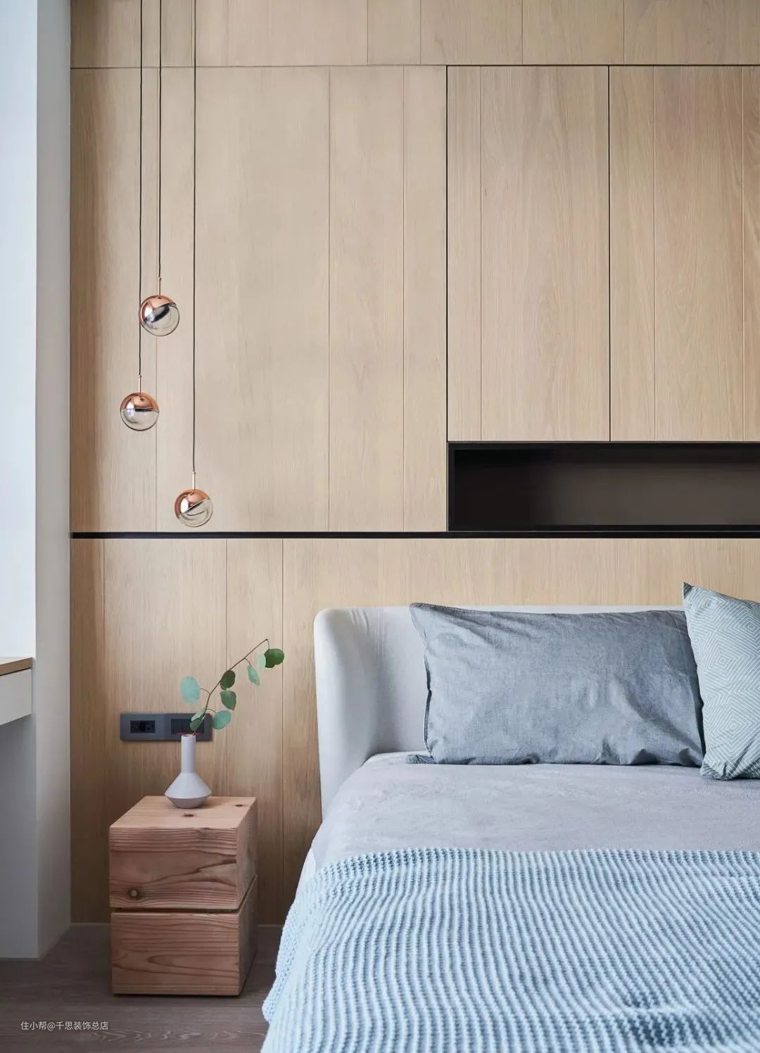 ▲现代简约的卧室,床头墙以木饰面为主体,加入一排黑色的小展示格,营造出一种自然舒适的档次气质。