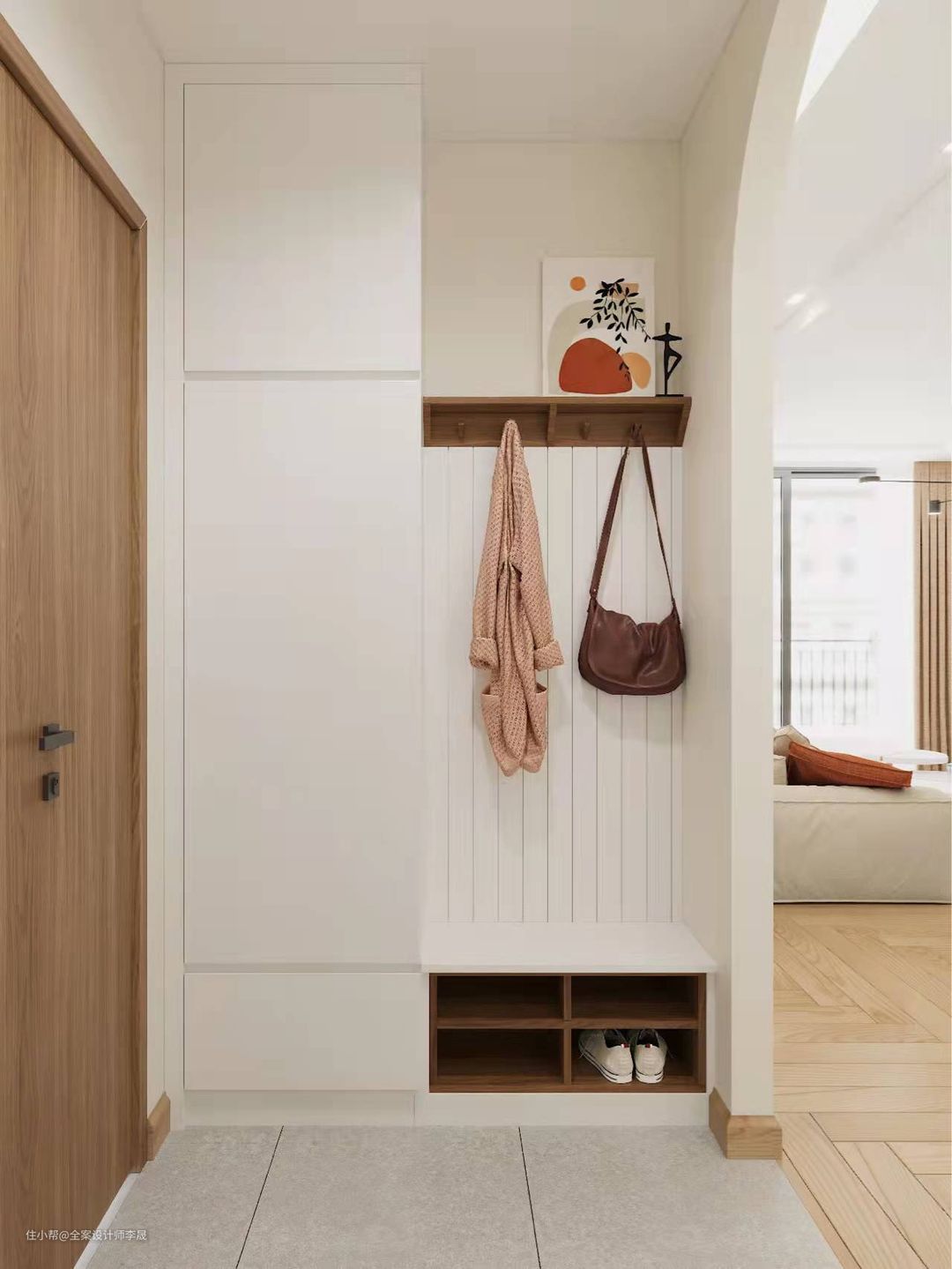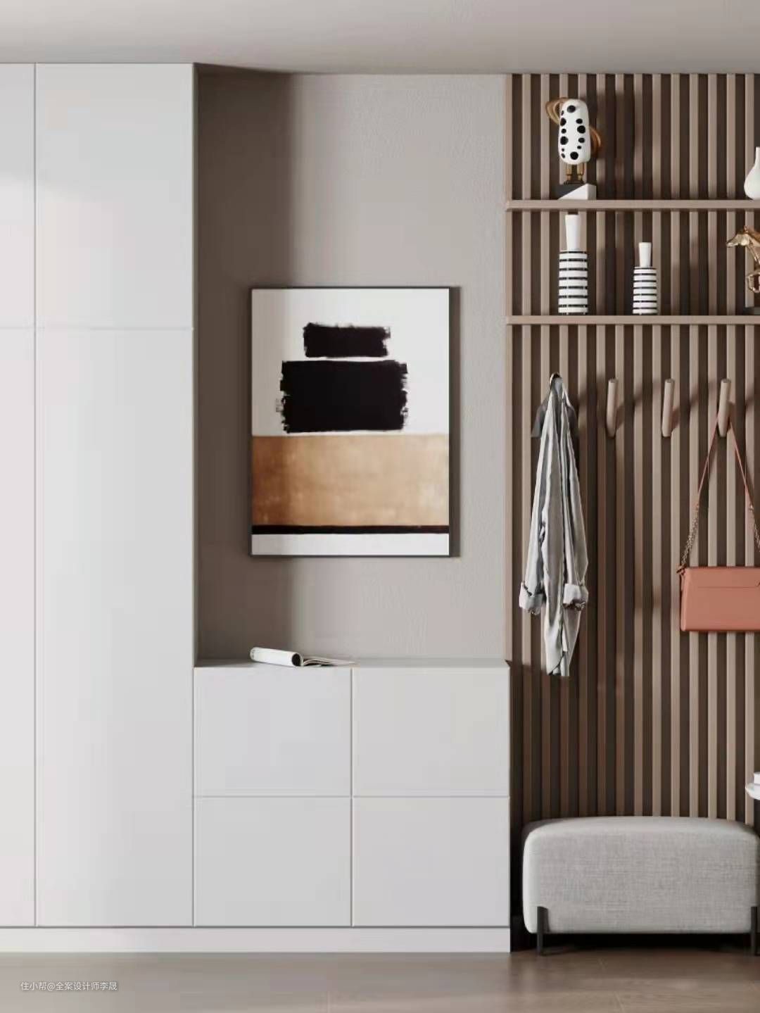 入户位置可根据空间大小,设计玄关柜、挂放区与换鞋凳融为一体,凳子下方镂空可放置常穿的鞋子。