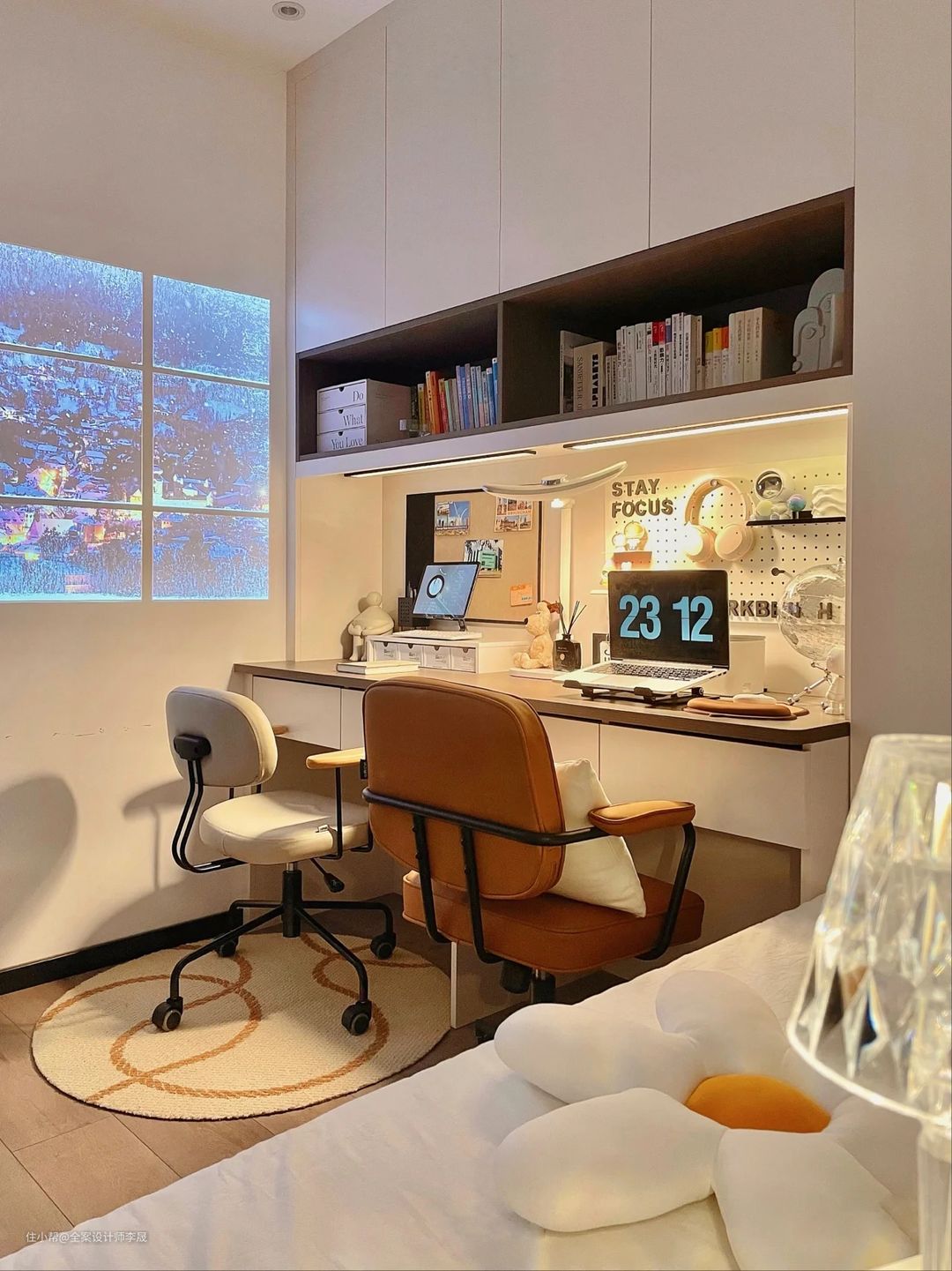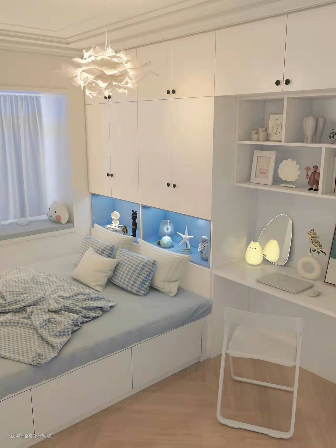 衣柜+书桌一体化设计,功能区布局更紧凑,集成设计非常省地方,且也高效的利用了房间的垂直空间,且把壁柜做成白色,视觉上显得更开阔明亮。