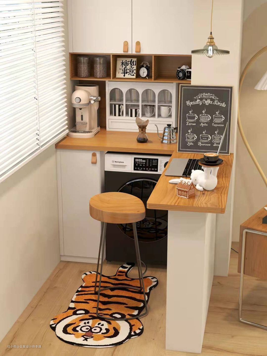 阳台面积有限,采用定制阳台柜,可分上下部分,吊柜做收纳区,地柜做防潮清洗台,预留洗衣机位置,一面墙就能搞定阳台区域的收纳。