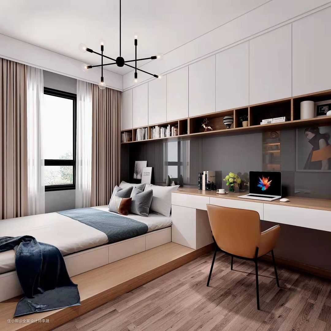 当卧室空间有限时,采用衣柜+书桌组合式的设计,可以最大程度利用空间,丰富空间功能。
