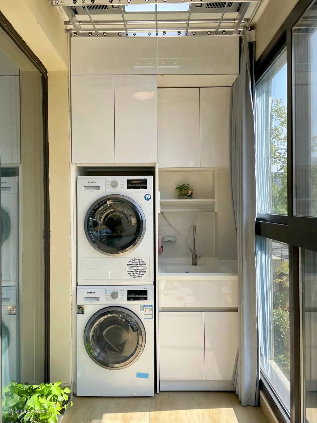 如果阳台作为晾晒区使用,储物柜可以与洗衣机柜巧妙结合。如果阳台作为景观阳台设计一款简洁大气的定制柜,配合精致的桌椅,也能将阳台打造成惬意舒适的休闲区,储物放松两不误。
