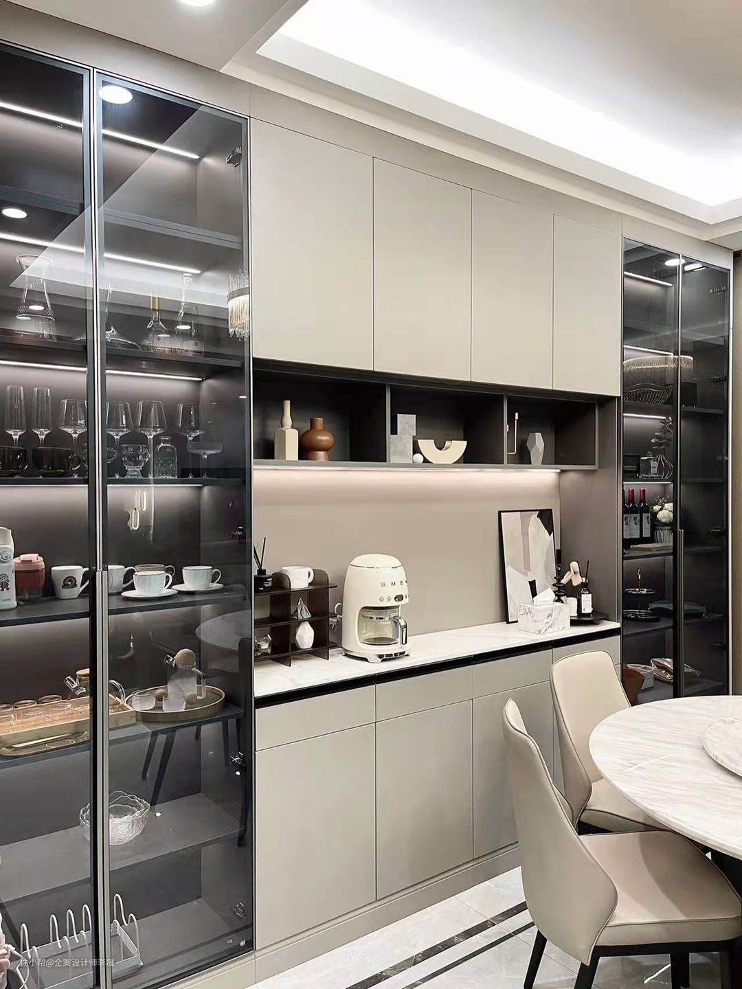 餐边柜可以采用吊柜+地柜+边柜的一体式定制形式,从不同形式上对不同性质的物品进行收纳。