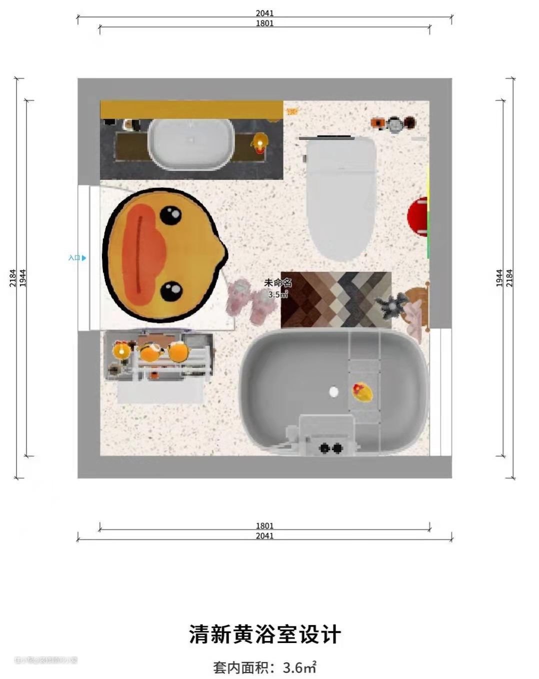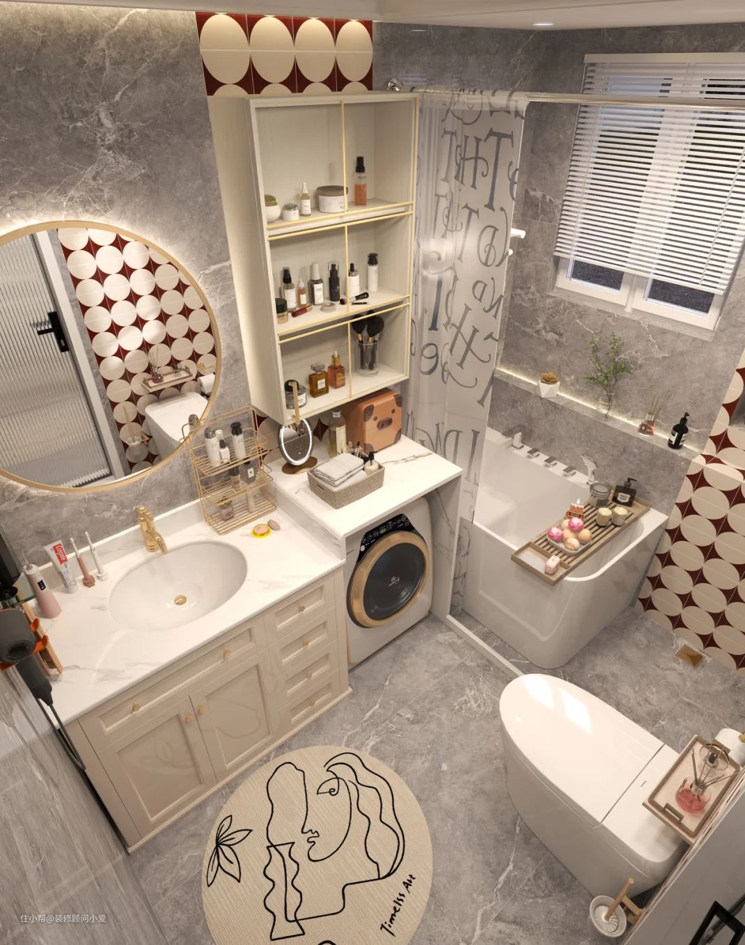 案例:3.6平方米浴室设计,塞下浴室柜、小型洗衣机、智能马桶、浴缸、花洒。