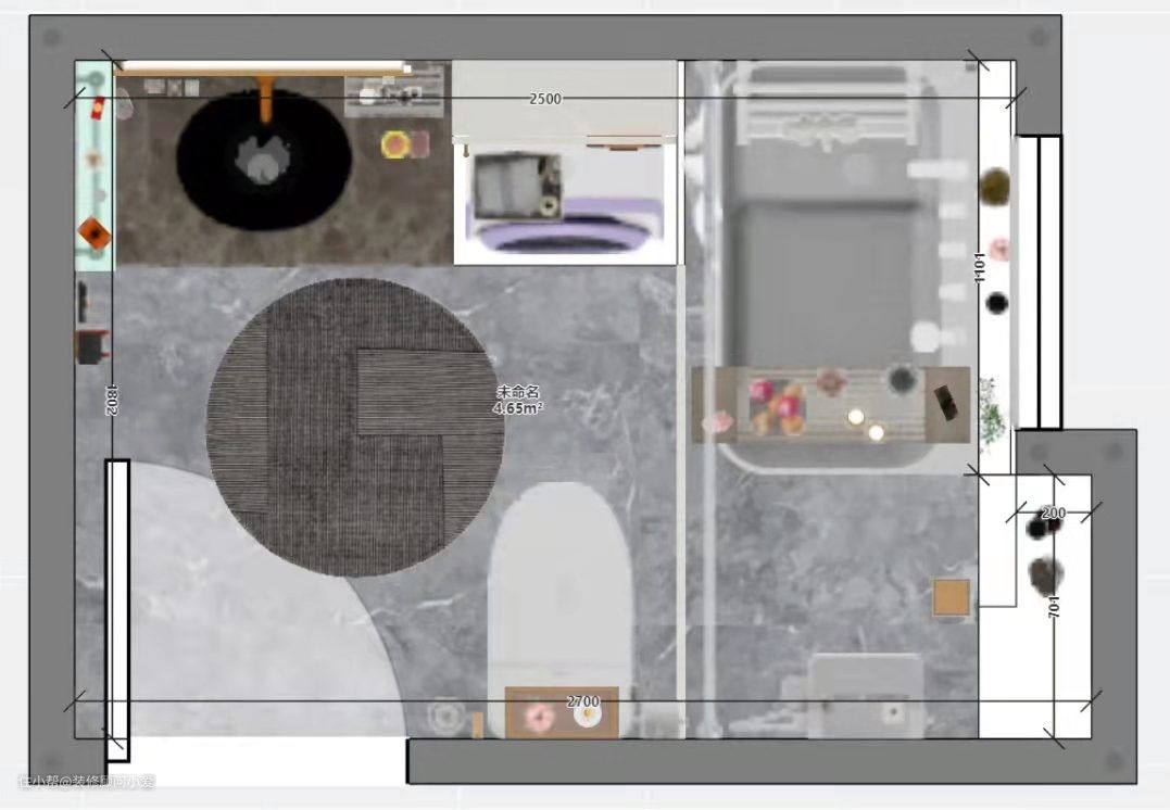 案例:4.65平方米浴室,安排上浴室柜、洗衣机、智能马桶、花洒、浴缸。