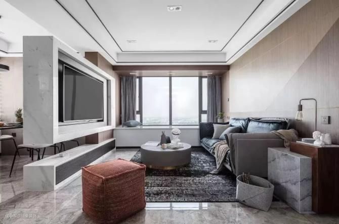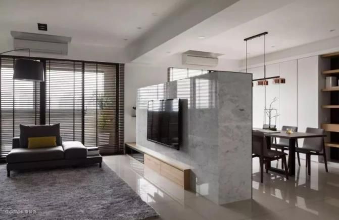 电视放在客厅与餐厅之间做为两个区域的分隔,电视墙另一面的空间可以做为收纳空间,增加空间的利用率。