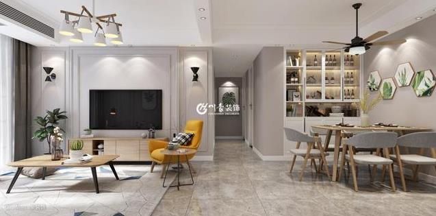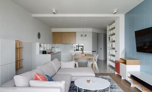客餐厅之间没有走道,又希望两个空间有个明显的划分,可以通过墙面、地面色彩的变化或增加收纳柜,将两个区域进行自然的过渡。