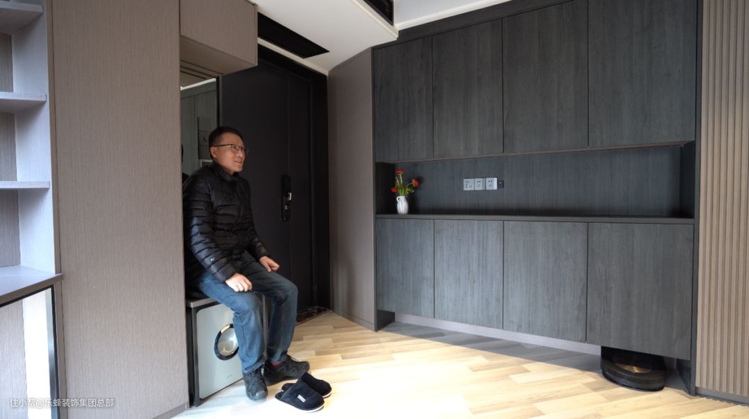 屋主在进门后通过鞋柜下的隔层拿取换穿的鞋子,在玄关的换鞋凳把鞋子换好,在背后的镜子能随时整理调整着装的整齐,整体动作环节流畅,极度舒适。