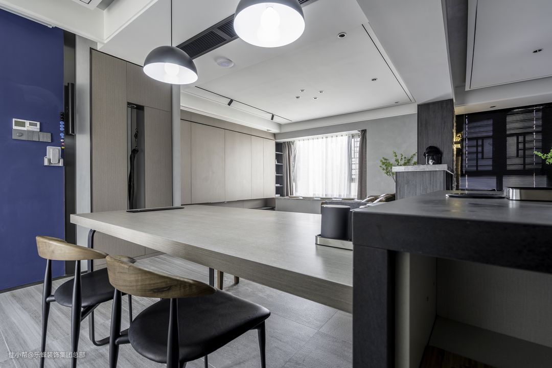 开放式的厨房及中岛台的设计,让家长和小孩之间的沟通更为顺畅,长条桌的设计也是为亲子活动及手工提供更为便捷的场地。餐厅背后的玄关柜,是将生活区和休息区分格的重要隔断,也保护了屋主的隐私性。
