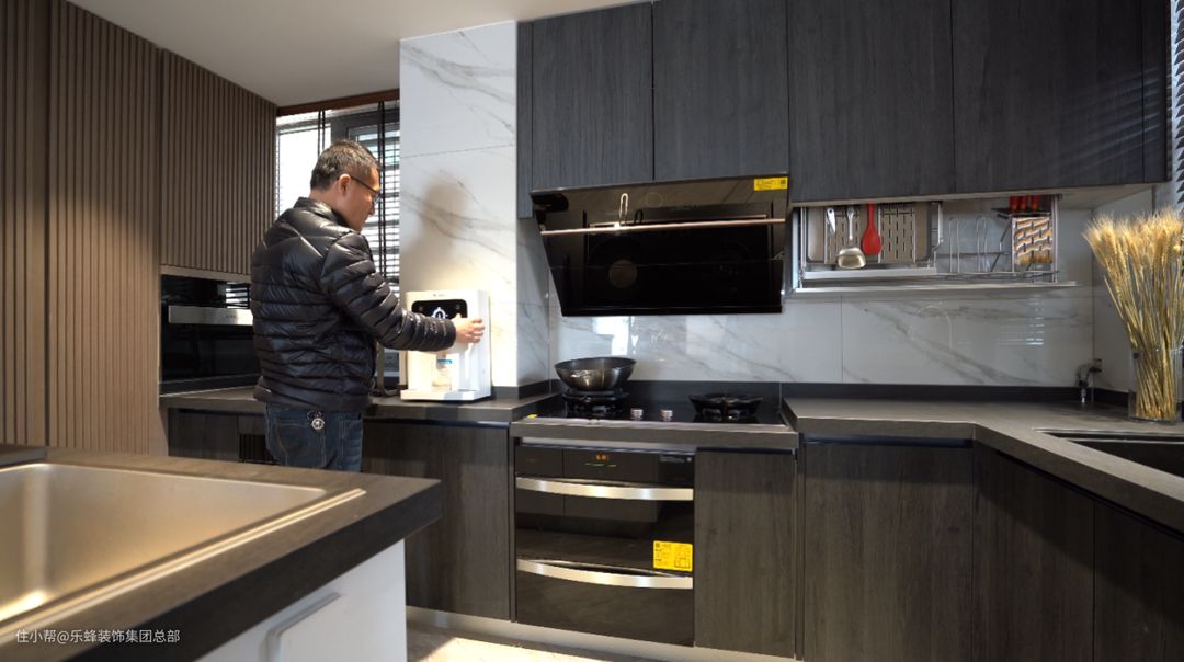 在餐厨设计上我们把空间全部打开,沿着内侧墙体做了L型橱柜,流畅的动线让日常的厨房家务活动的量大大减少,同时还配置了很多电器来提高生活质量,洗碗机、蒸烤箱等家电的使用让生活更加舒适安逸。