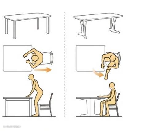 我们常见的桌子都是四腿桌,起身时需要将椅子往后拉出,而两腿的构造则方便许多,没有桌腿的干扰,只需旋转身体就可以轻松出入。