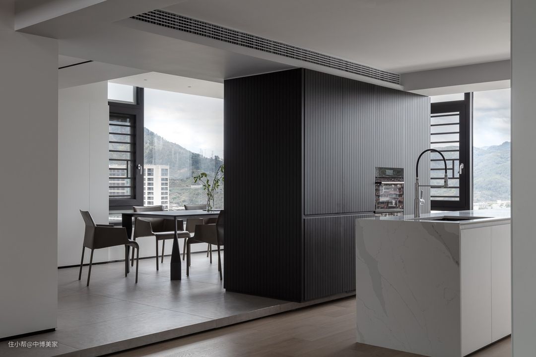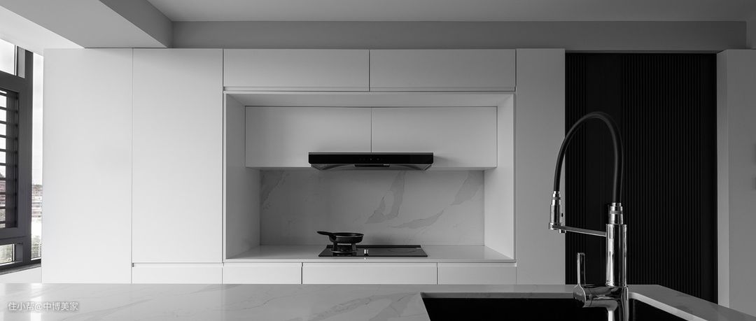 厨房运用了大笔的白色渲染,玻璃窗不仅增加了空间的通透感,同时将窗外的绿色美景印入其中,虚实相生。