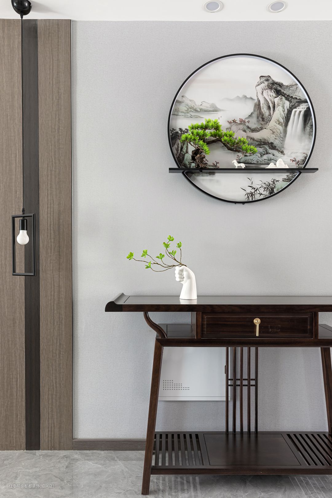 带着禅意的新中式玄关,金木黑檀玄关柜翘头飞角,造物兴宅;榫卯结构,不用金属连接,巧夺天工,大白墙上迎客松壁灯静谧清雅,入户迎面而来主人家的随性自然。#实拍完美家