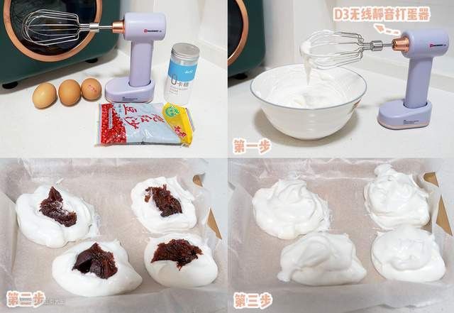 所需食材:鸡蛋清3个、零卡糖30g、玉米淀粉20g、红豆沙、一丢丢柠檬汁