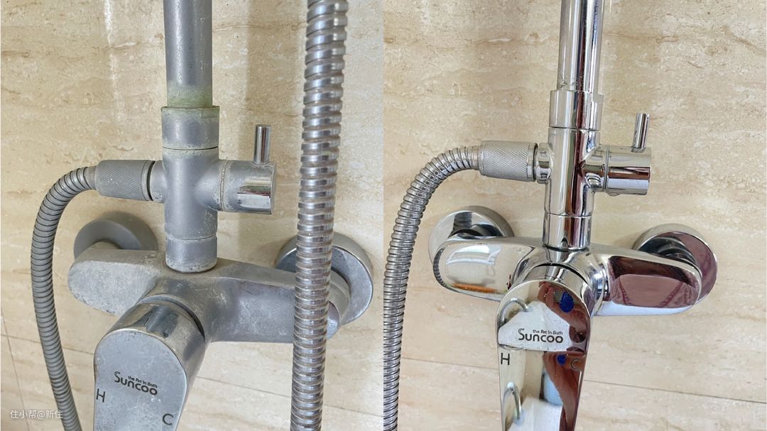 淋浴喷头、水龙头、玻璃隔断等,表面的花白水垢,用柠檬酸溶液,喷在上面,静置一会儿擦拭掉,就锃光瓦亮了。