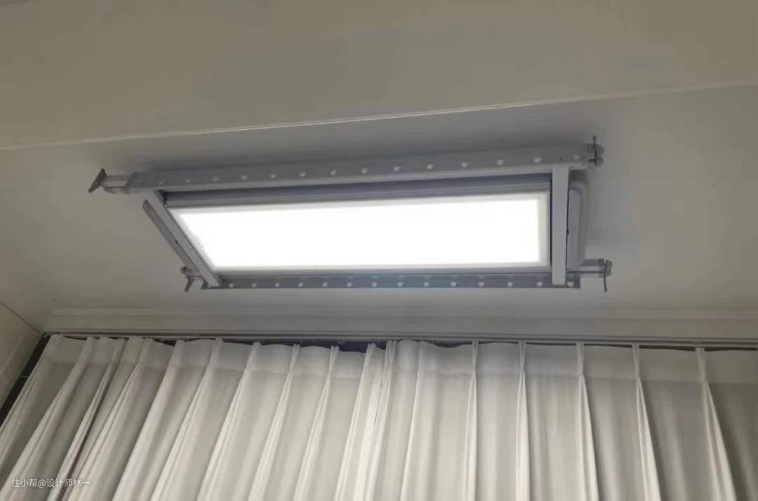 天花板使用了电动晾衣架,只有10cm的厚度,不晒衣服的时候藏在顶部完全不影响美观,自带全面板照明,三色光源可以切换,非常实用。