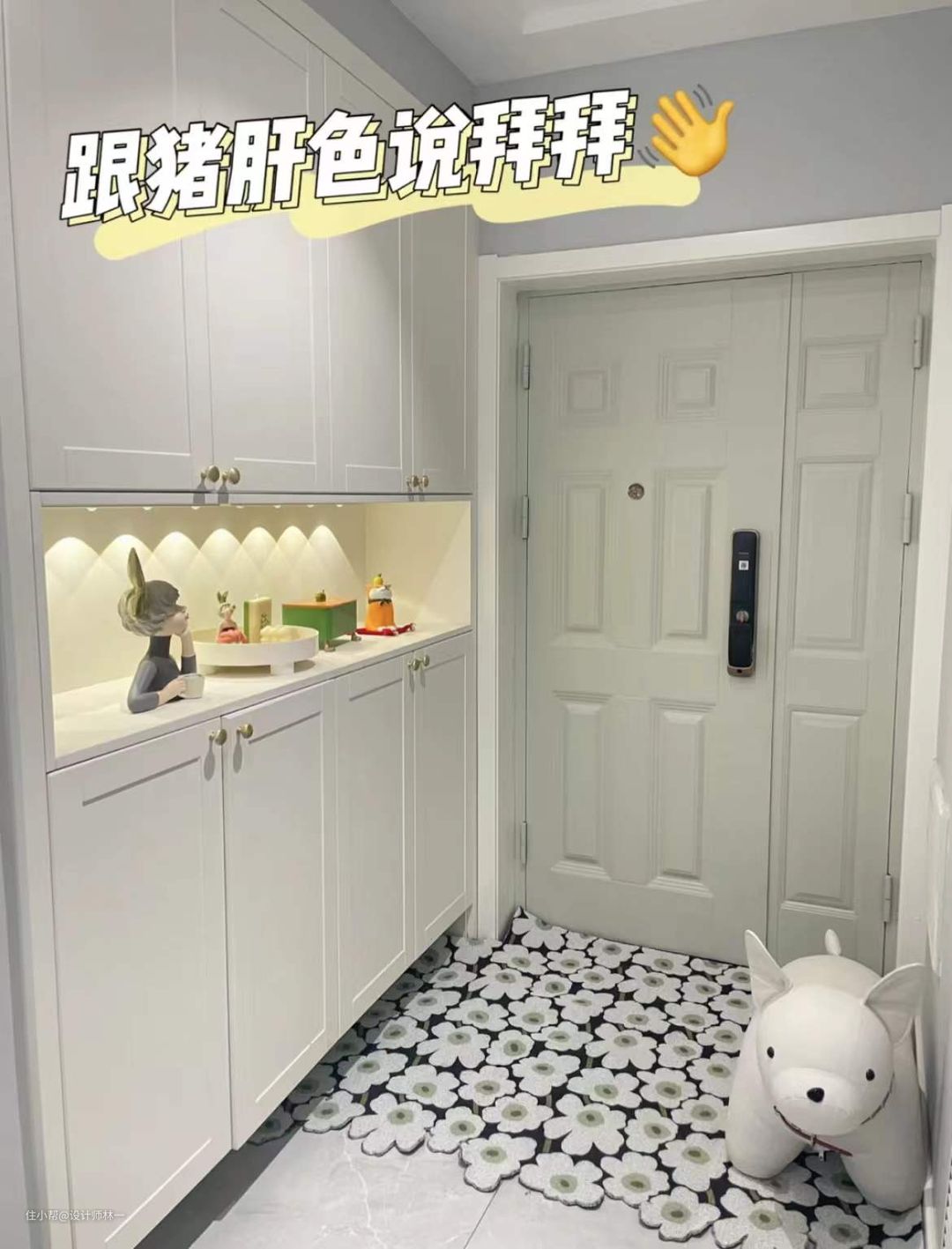 最后的效果很nice,入户门左边定制了内嵌式的顶天立地鞋柜,中间留空处用于收纳常用的小物件,搭配免布线感应灯,提供了明亮的光源,同时小山丘的光影氛围感十足;