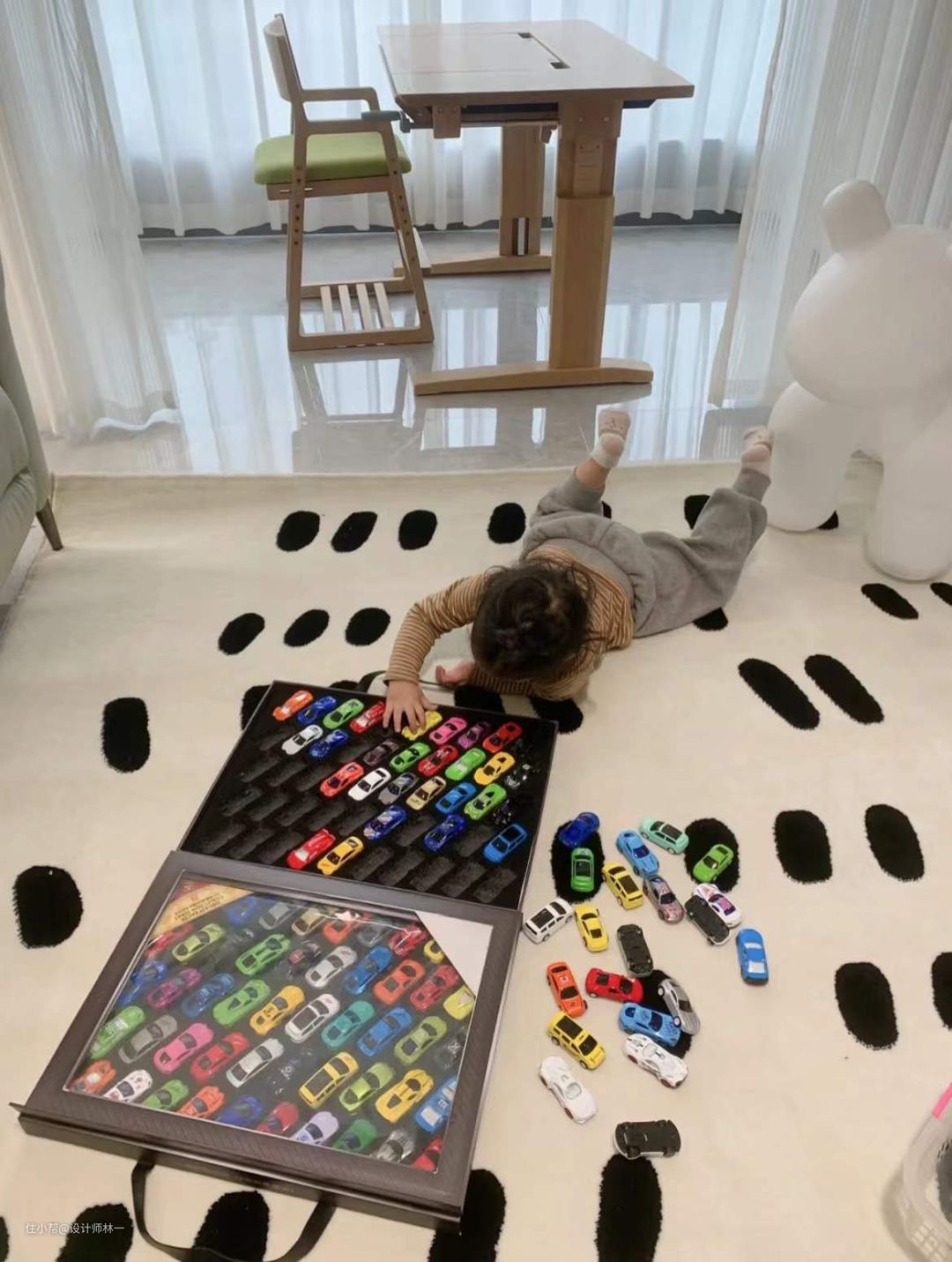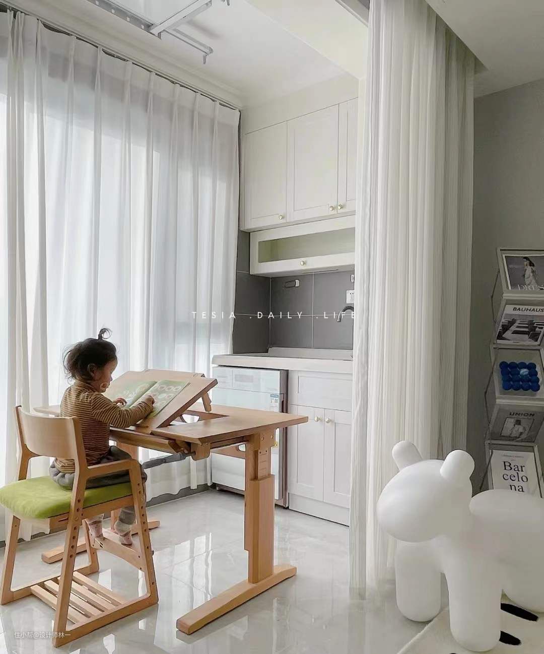 中间放置了一个孩子的实木学习桌,原木的材质比较环保,平时用来玩玩具,看书的时候可以把桌面立起来,还可以根据小孩子的需求调节高度,很实用。