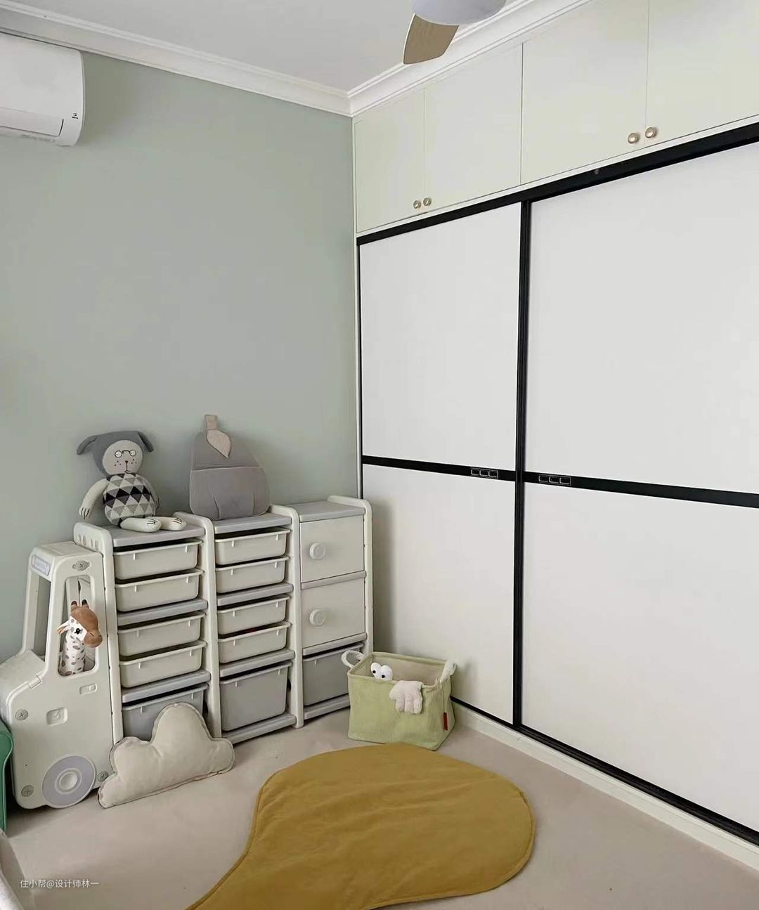 因为卧室比较小,干脆放弃床,给孩子打造一个ins风的儿童房好啦,墙漆是立邦的波音飞机(这个颜色太仙啦!都给我刷它),因为是通铺的地砖,过于冰冷,所以全铺了一张大地毯,整个房间立马温馨起来,孩子经常坐的地方放了一个大鸭梨的爬爬垫,厚实又好看;