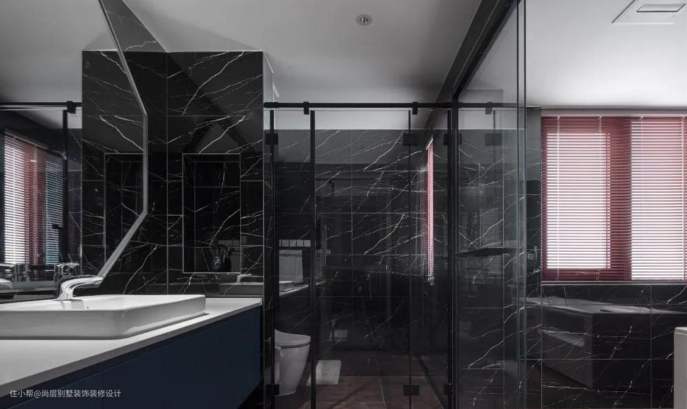 卫浴间干湿分离,暗红色地砖、黑色墙面、深蓝色橱柜、白色洁具,四种颜色使卫浴间成为颜色冲撞最厉害的地方,却又完美地融合在一起。