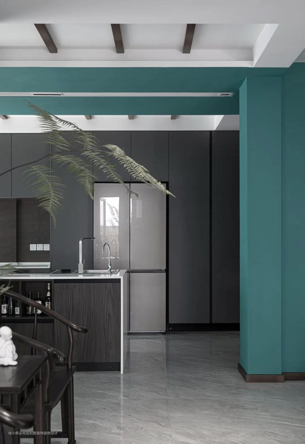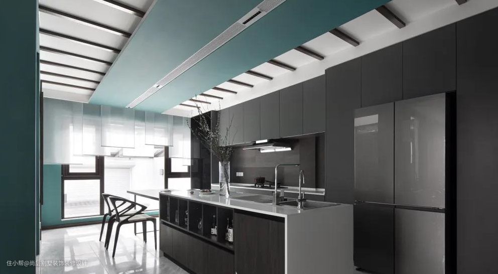 西厨或许是玉京内最有现代气息的地方,整体黑白灰与绿的色彩搭配,展现出设计的巧妙之处。开放式的空间,朝南的落地玻璃窗保证了整个西厨的宽敞明亮。狭长的岛台和四人小桌的组合,是家里人彼此沟通互动的中心。