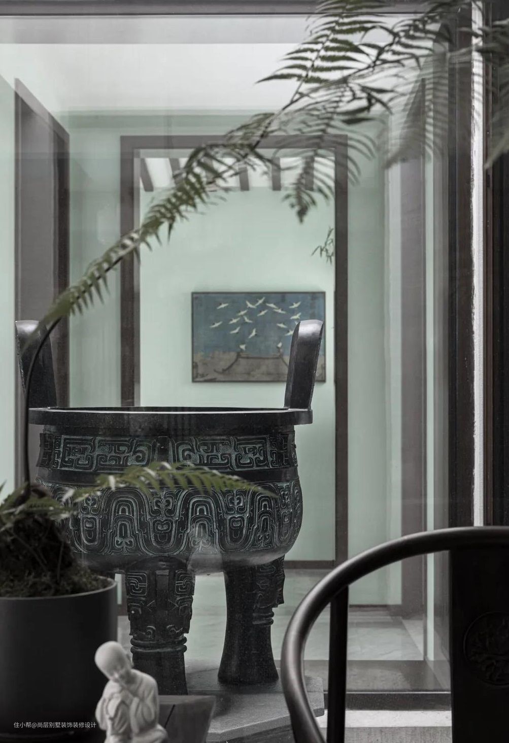 蟹眼天井中摆放着青铜三足大鼎,取凝财聚气之意,纳天地之气,迎四方宾客,器物与人,总有着千丝万缕的联系,沉雄厚实的铜鼎器制,将主人玄羲对于老物件的热爱表达出来。