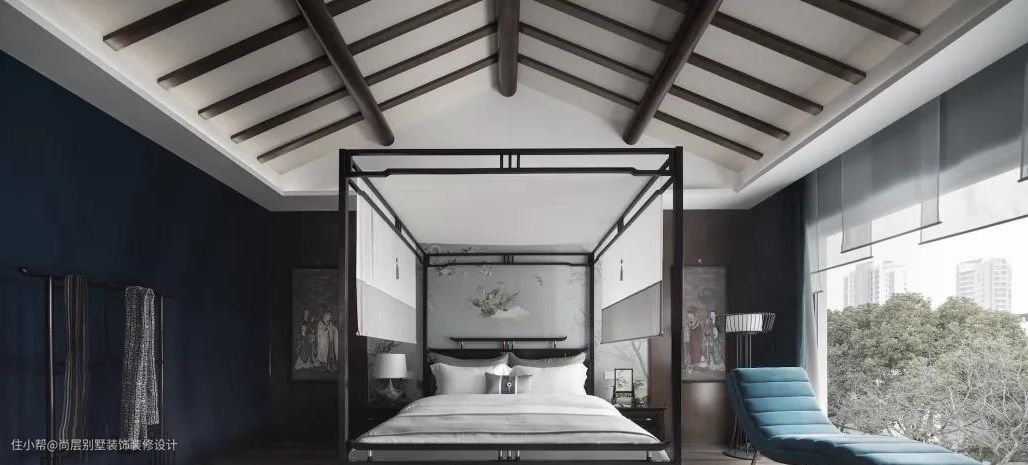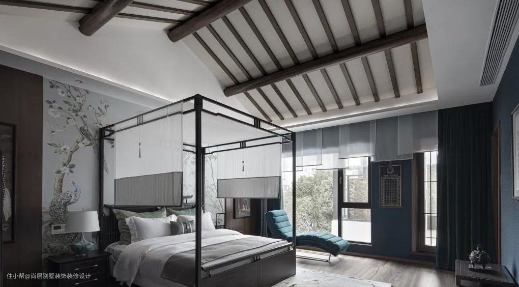 古典的架子床作为主卧的主要焦点,背景上画的是百鸟之王凤凰,其不落无宝之地,也是吉祥的神鸟。窗前摆了一张蓝色沙发椅,躺在这里可以尽览楼下美景