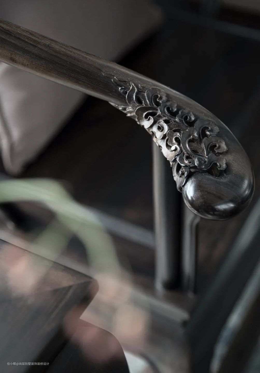 设计师将两面的窗户打通,通过落地窗来增加空间的光照。从玄关到客厅,自浅绿到墨绿逐步过渡,绿色成为空间的主色调。深绿色的墙体与木饰、檀木家具相互辉映,充分奠定了“木”的基调,为整体空间增添了浑厚而又宁静的庄严氛围。