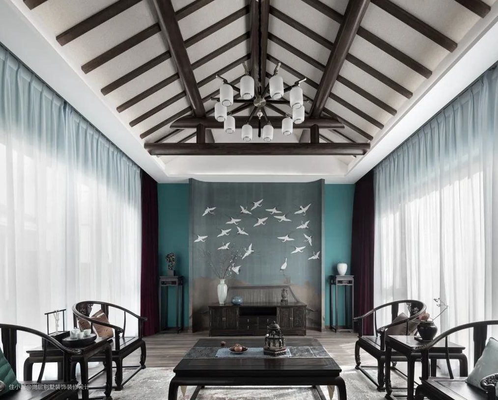 茶室顶面延续了客厅的人字顶,一张“上善若水”的字画诉说着主人的心性和品质,“水善利万物而不争”,阐述了为人要顺应大势,善道而行。