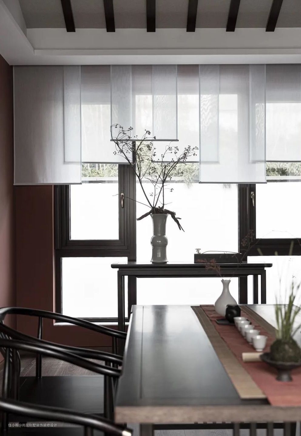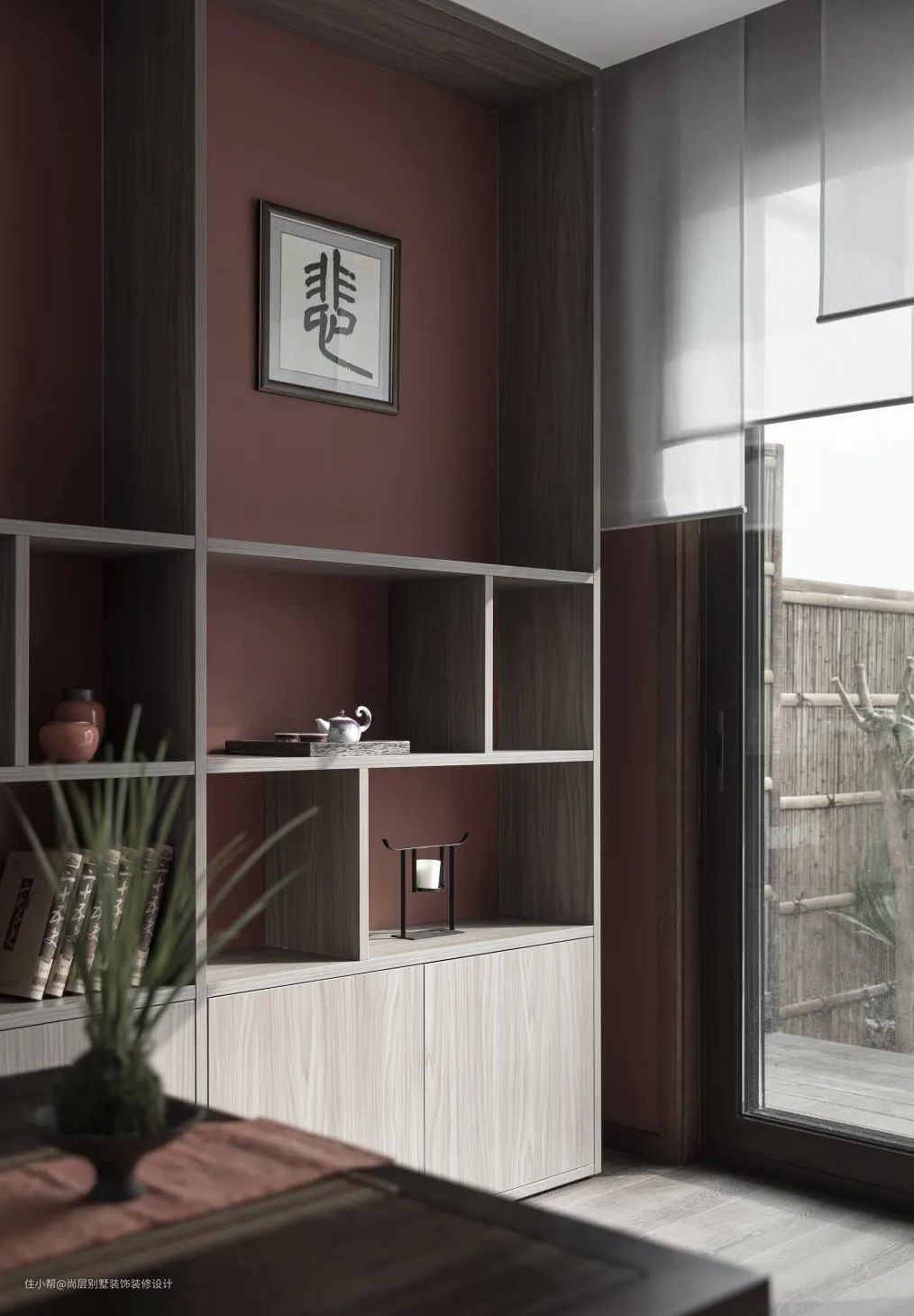 室内的每一处都和室外的自然景色相互连接,木质材质充斥在空间,彰显沉稳与含蓄。空间深处一幅泛着岁月痕迹的画作,加上一株单峭的花枝,设计将艺术融于画面之前,颇有意境之美。