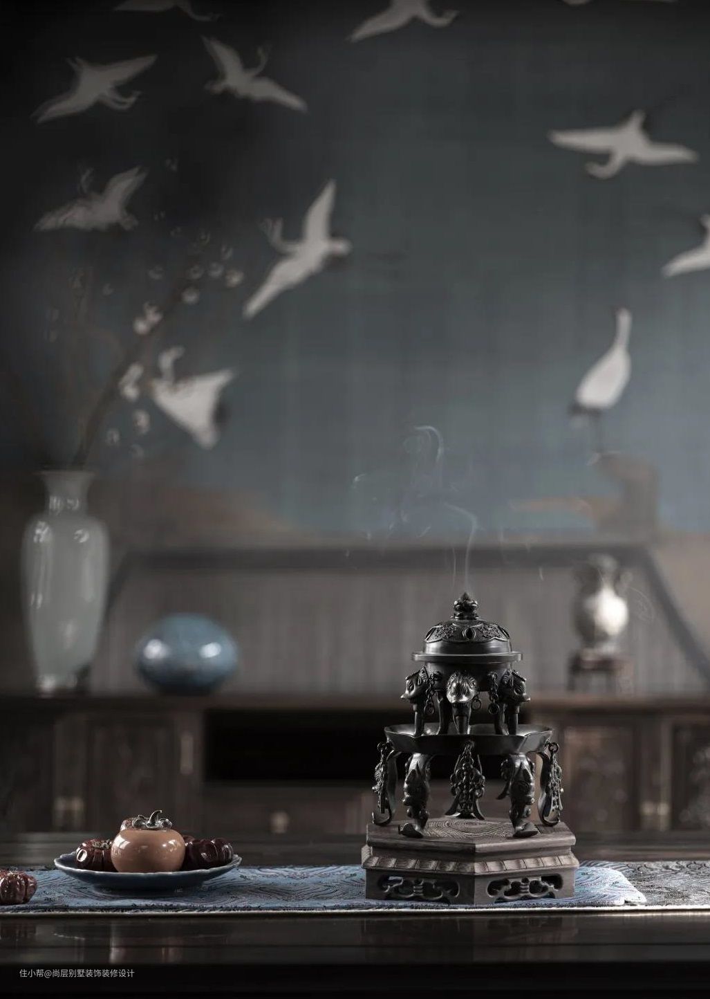 “晴空一鹤排云上,便引诗情到碧霄。”徽宗《瑞鹤图》为背景,给空间的意境融入了更深的层次。设计细节将无始无终的自然之气凝聚在家中,形成无所不在的心灵关照。
