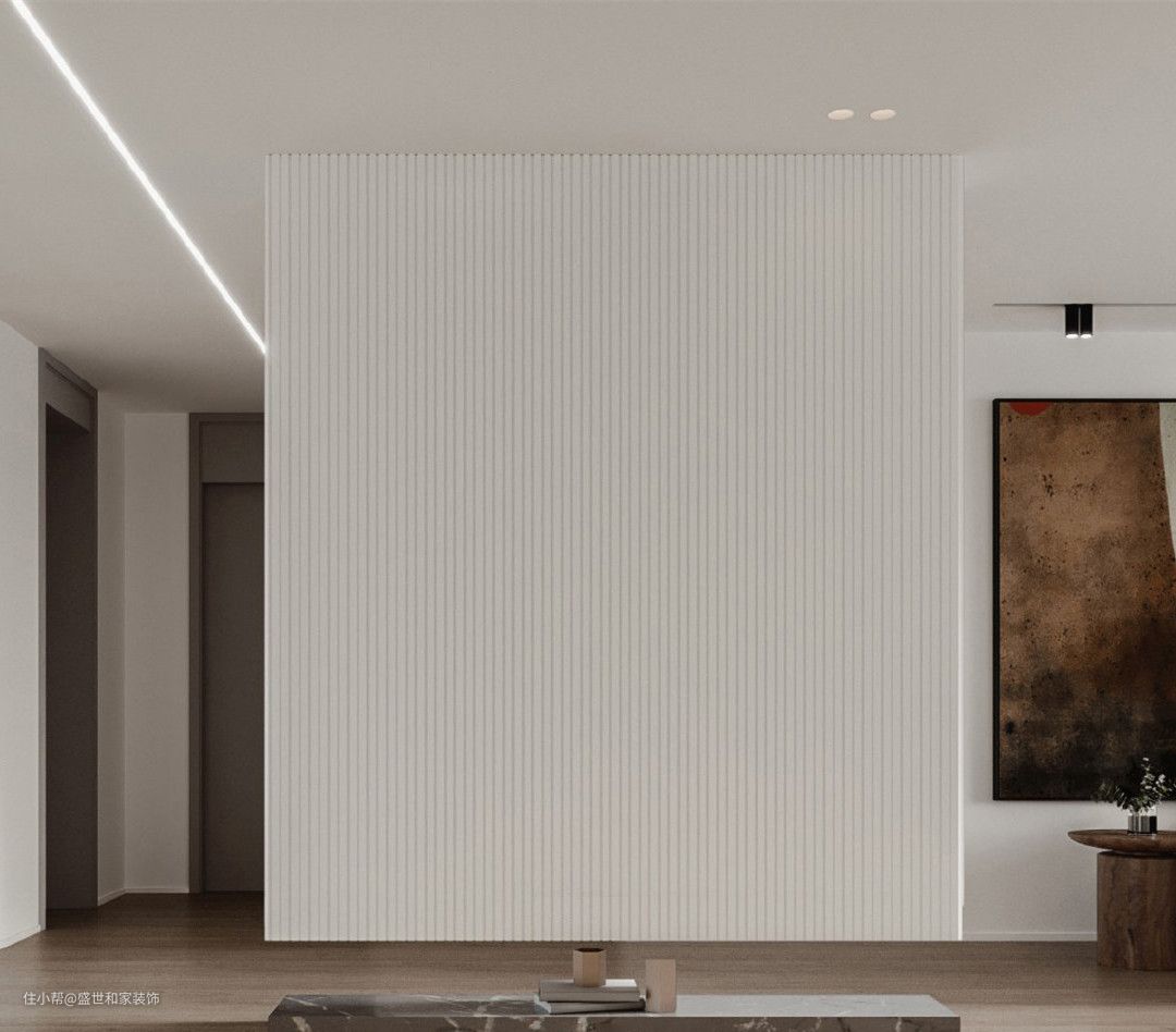 表面增加木线条装饰之后,大大增加了玄关吊柜的颜值;选择按压式的开关柜门方式,无把手设计让柜体更加清爽~